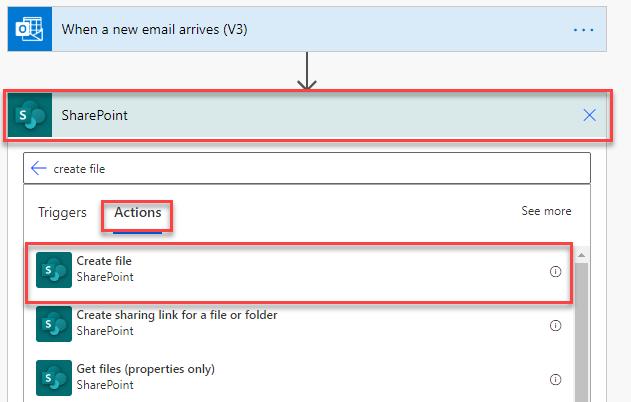 Here I have Selected Standard connector “SharePoint” and selected action as “Create File”.