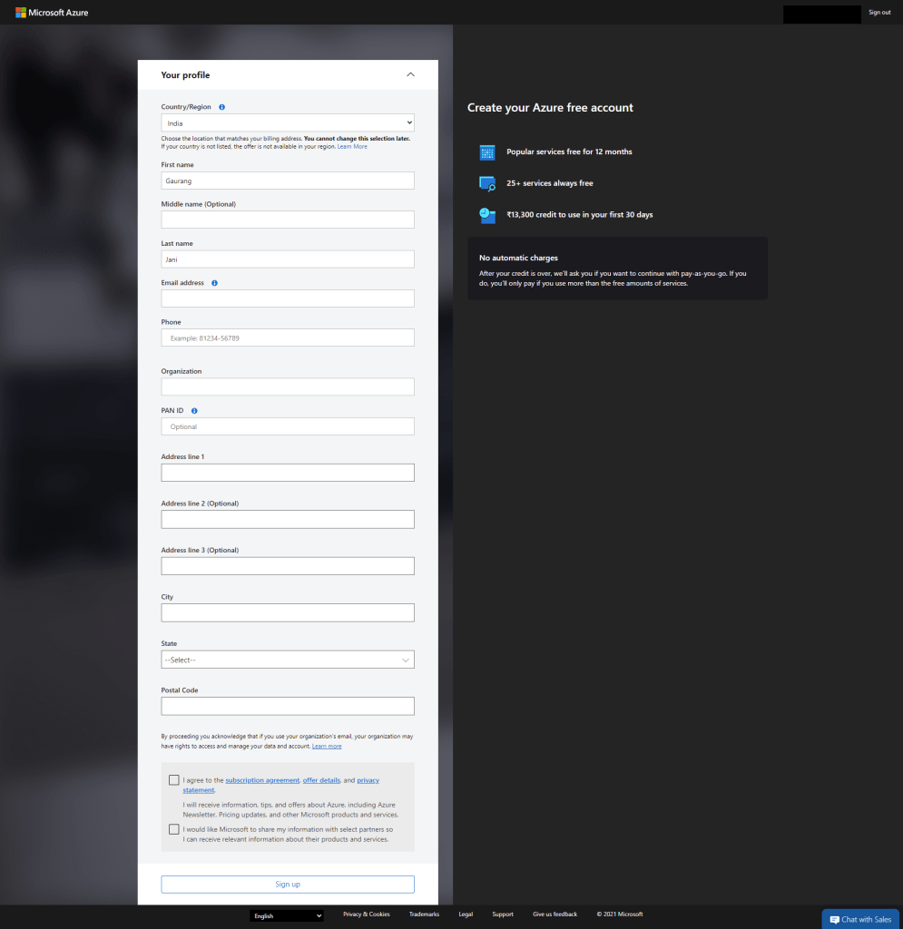 First you require Official Account to sign up for Azure. Now let’s create Azure Account. Currently azure providing offers where you can create account for free and get 12 month’s service absolutely free.