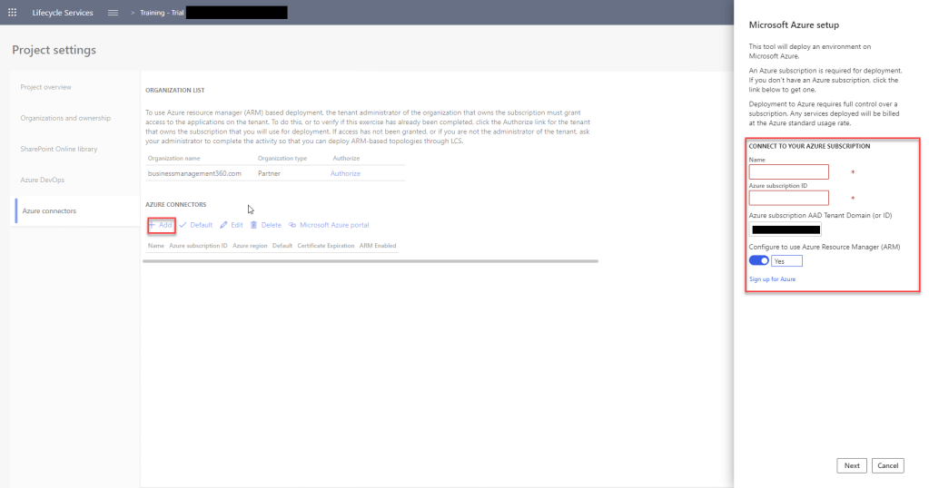 Next Step will be Add Azure Subscription to LCS. Add new Azure Connection. Provide relevant details and click Next.