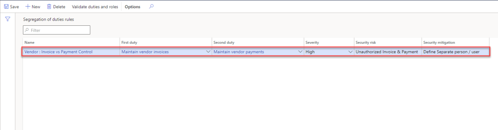 - In the list, find and select the desired record. Select the second duty that is controlled by the rule. (Select : Maintain vendor payments)