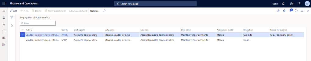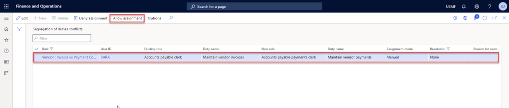 - Allow assignment: This will override the conflict and allow the user to be assigned to the additional security role. If you override a conflict, you must enter a reason in the Reason for override field. All overridden role assignments can be viewed on the Segregation of duties conflicts page.