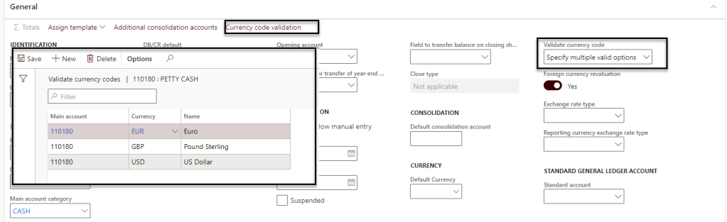 - Specify multiple valid option : the Currency field must contain a value for each journal voucher in the general journal; the value must be a currency code that is defined in the Validate currency codes page (i.e. K. Currency code validation)