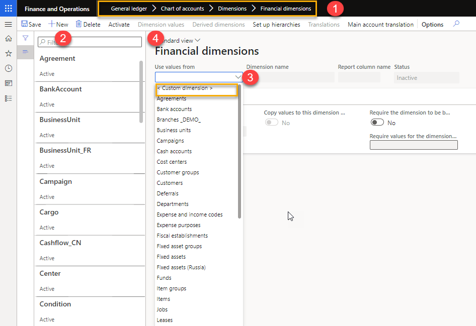 To create a user-defined financial dimension, in the Use values from field, select Custom dimension.