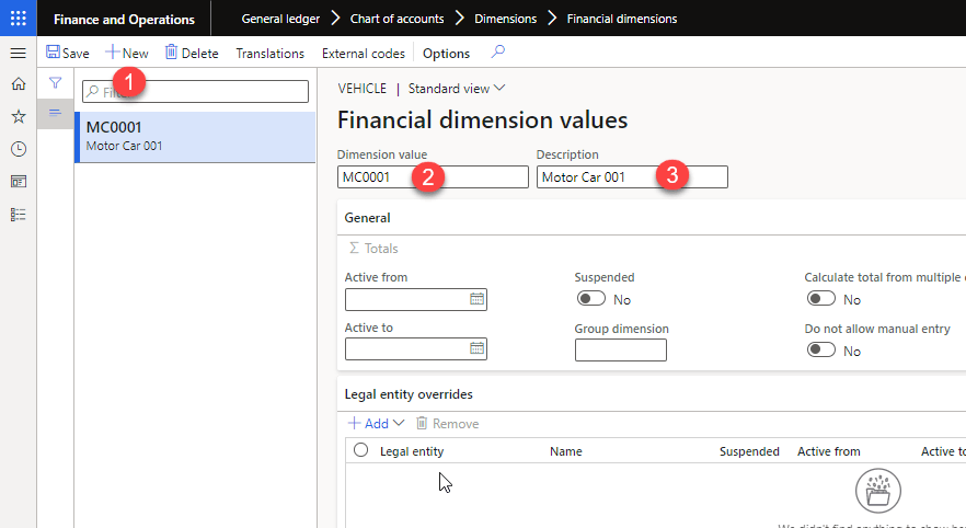 - Click on “New” to create new record in dimension value