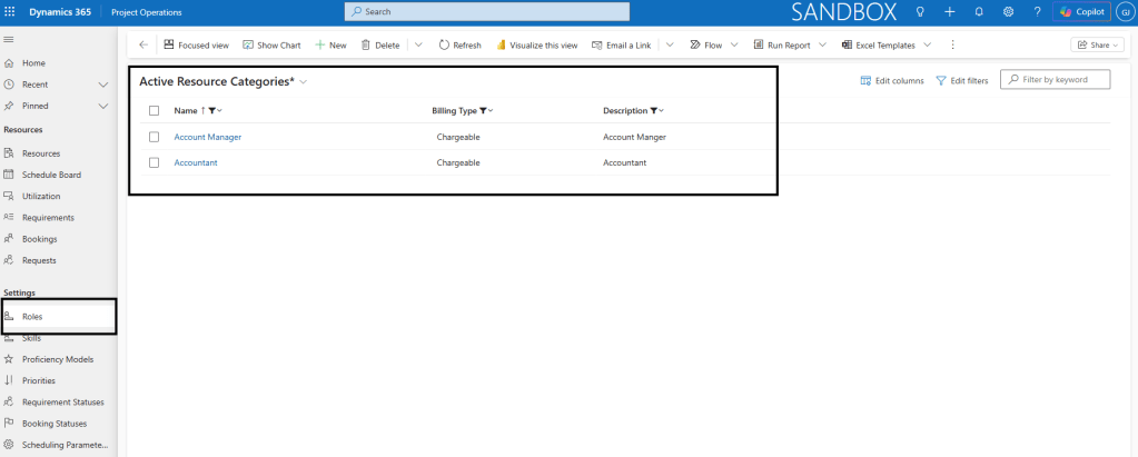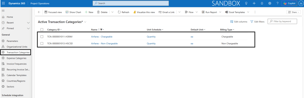Validation check: Create a transaction category in Project Operations and confirm it appears in Finance under Project categories within a few minutes. This confirms the pipeline is live.