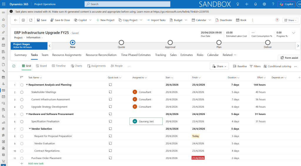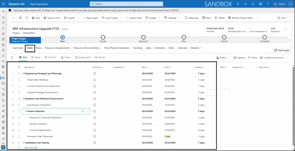 Navigate to the Tasks tab. Create your WBS (phases → tasks → subtasks). For investment projects, tasks typically represent capital budget deliverables. The WBS syncs to Finance as project activities and as project forecasts.