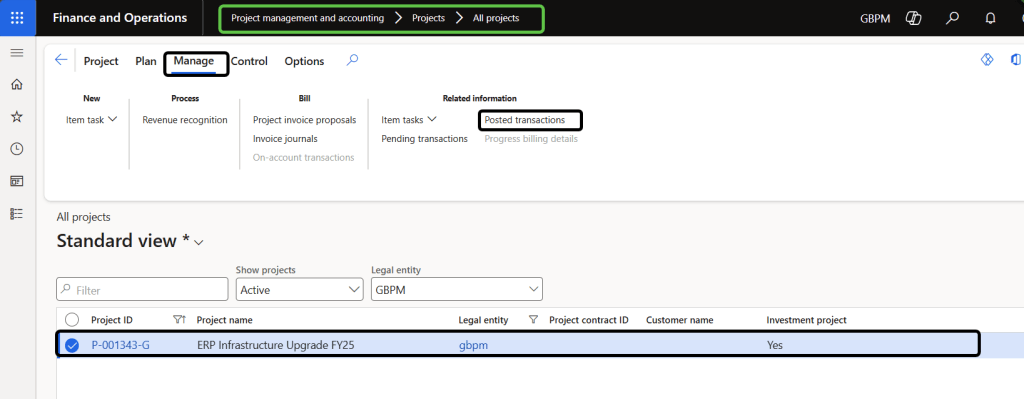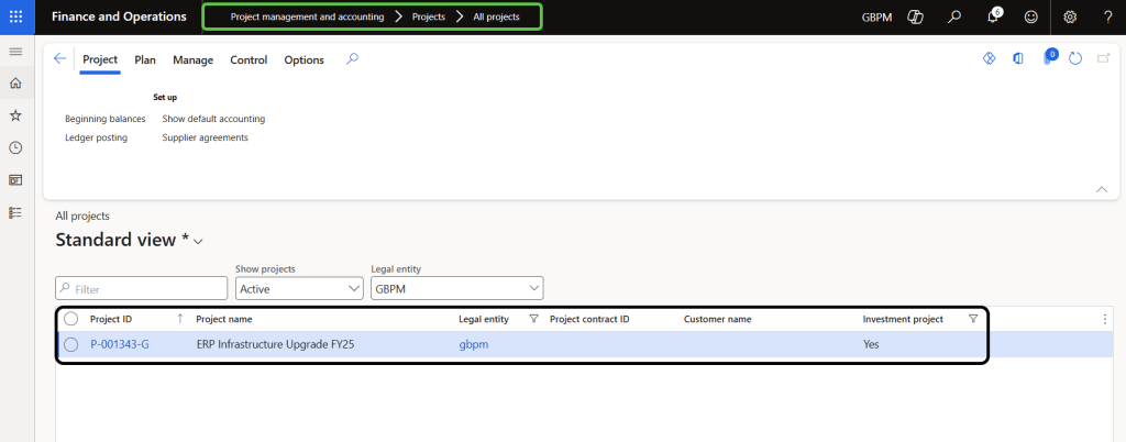 Navigate to: Dynamics 365 Finance → Project management and accounting → Projects → All projects
