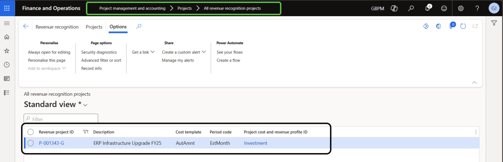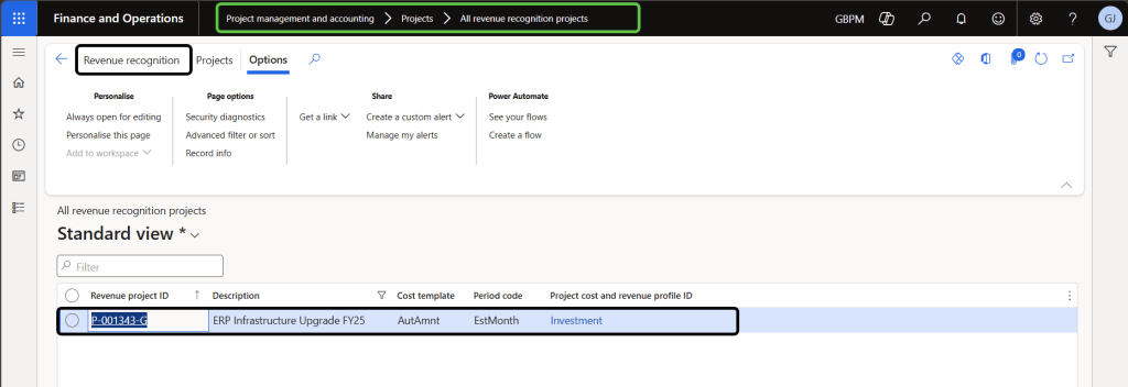 Select the Revenue recognition project linked to your investment project. This is where the periodic WIP assessment and eventual capitalisation take place.