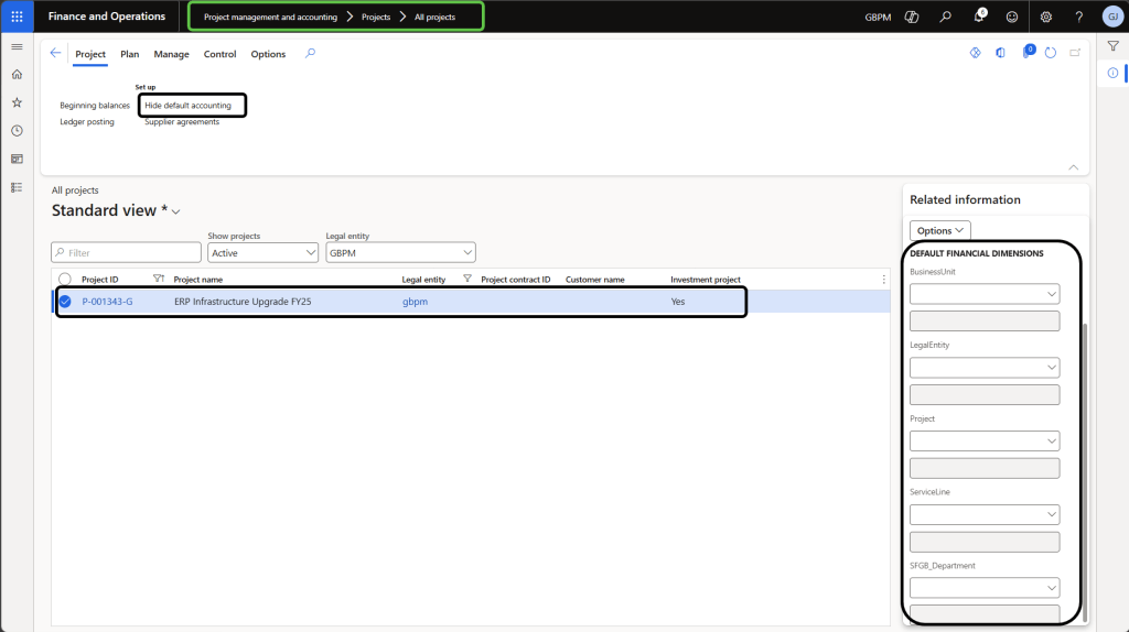 Confirm the project is marked as type Investment, the name and dates match Project Operations, and the Owning company is correct. The project stage should show as In Process (This is default in Dynamics 365 FSCM, you can check by adding column in list page).
