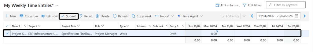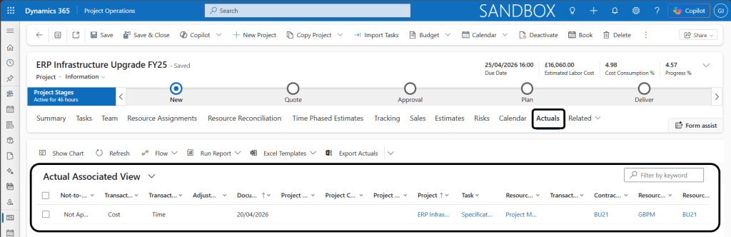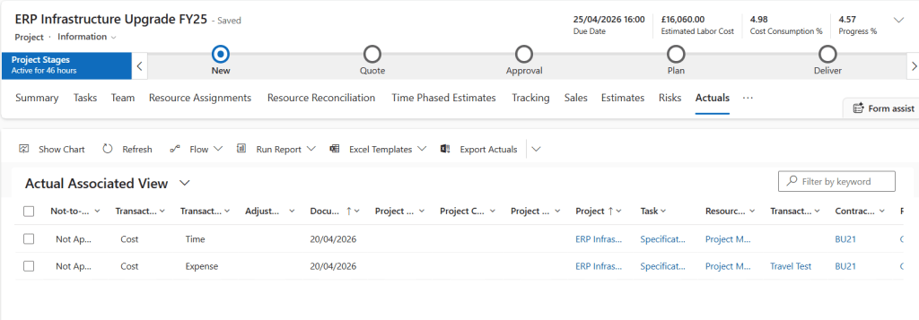 Note: Actuals in Dataverse are immutable once confirmed. If a correction is needed, use the Recall action, which generates a reversal actual. Both the original and the reversal will transfer to Finance, producing a net-zero entry in the integration journal.