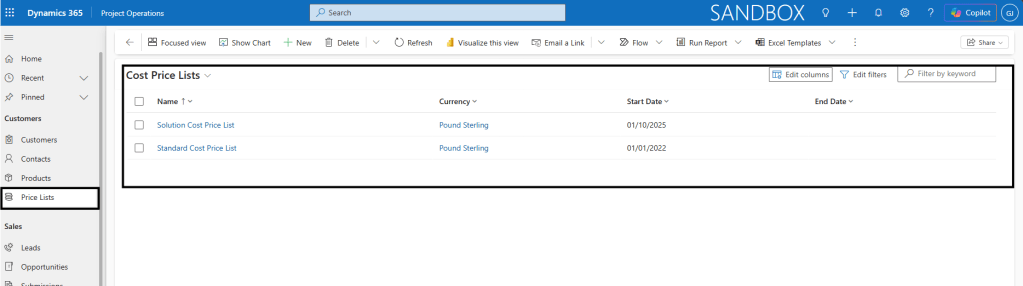 Set up cost price lists for each Organisational Unit. For investment projects, billing price lists are not needed. The cost price list is required to validate resource cost entries and drive cost actuals. Create one list per currency per organisational unit.