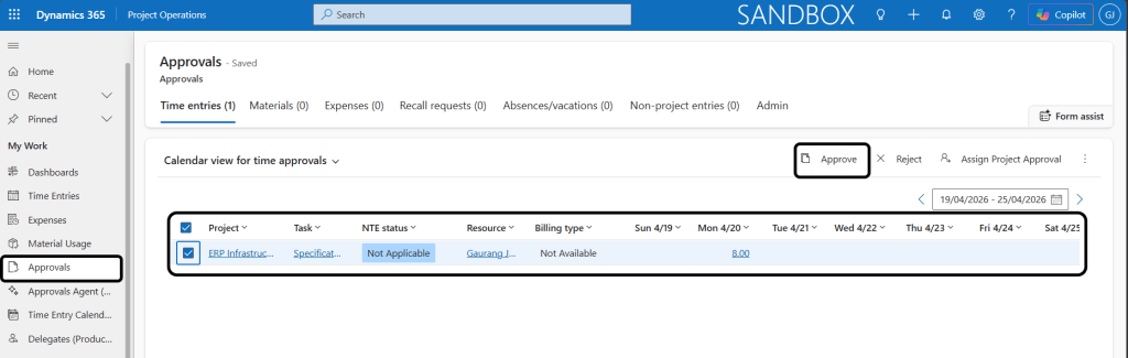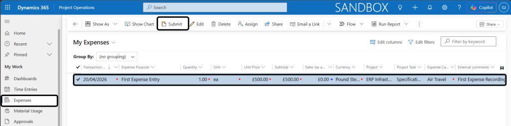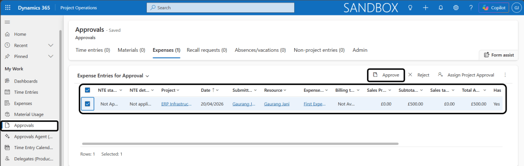 Submit for approval. The approver reviews in the Approvals queue. On approval, a cost actual is created in Dataverse and queued for sync to Finance. if it’s created and submitted in Expense App it will on appear in Project until it’s posted in Dynamics 365 Finance.