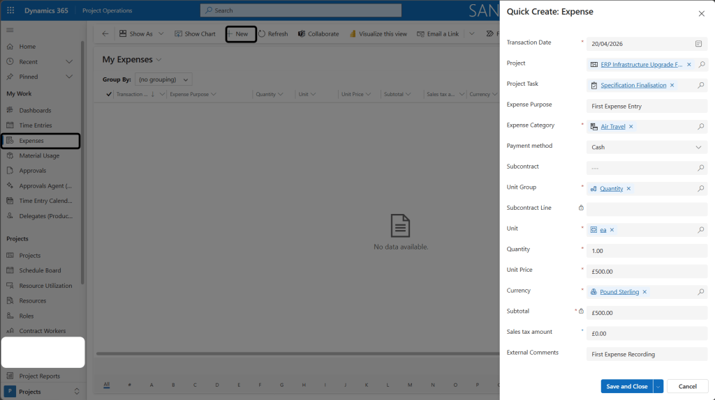 Navigate to: Project Operations → Expenses → New Expense. Select the project, category (e.g., Travel), date, amount, and currency. This is just to record expense (not as employee reimbursable expense)