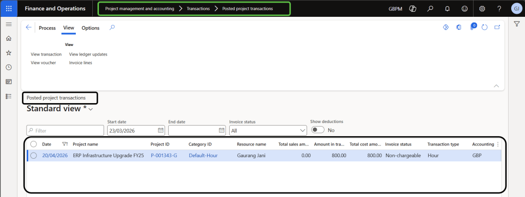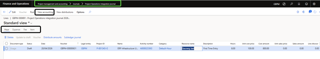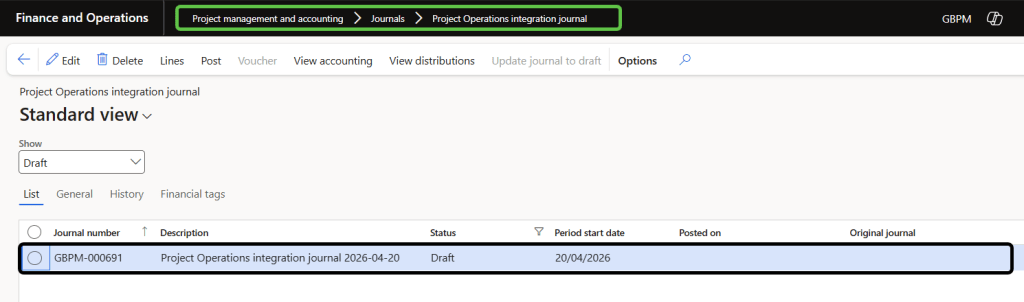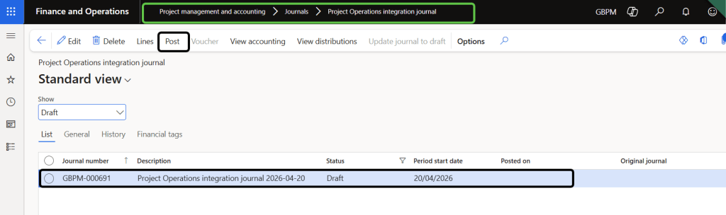 Navigate to: Project management and accounting → Journals → Project Operations integration journal. Use the batch process: Periodic tasks → Import from staging table. This moves staged lines into a journal header ready for review. This shows all actuals from Project Operations staged but not yet posted to the GL in draft stage.