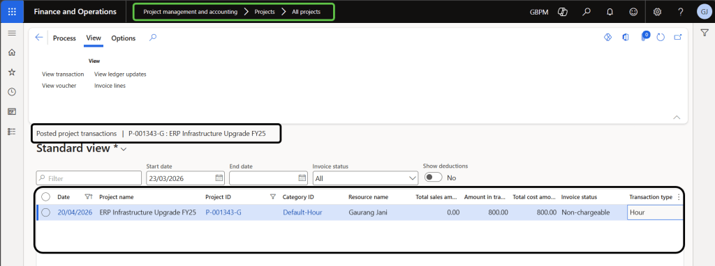 From any project transaction, click Voucher to see the debit/credit accounting entries. For investment projects, you should see a debit to the WIP Cost Value balance sheet account, confirming costs are being capitalised and not expensed.