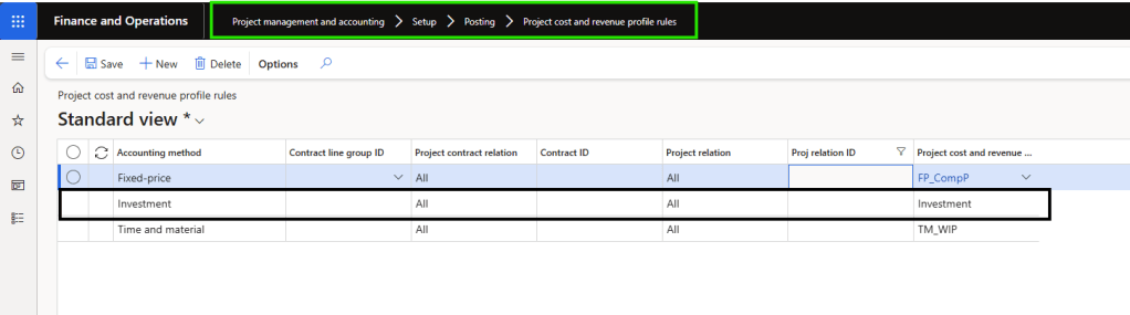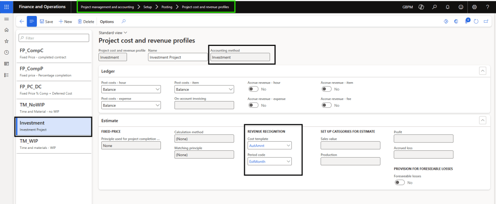 The Finance configuration for investment projects no longer uses Project Groups as the primary accounting control. Instead, the correct setup uses Project cost and revenue profiles with the new Investment accounting method introduced specifically for this feature.