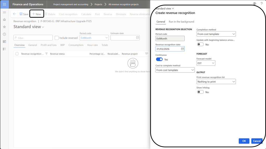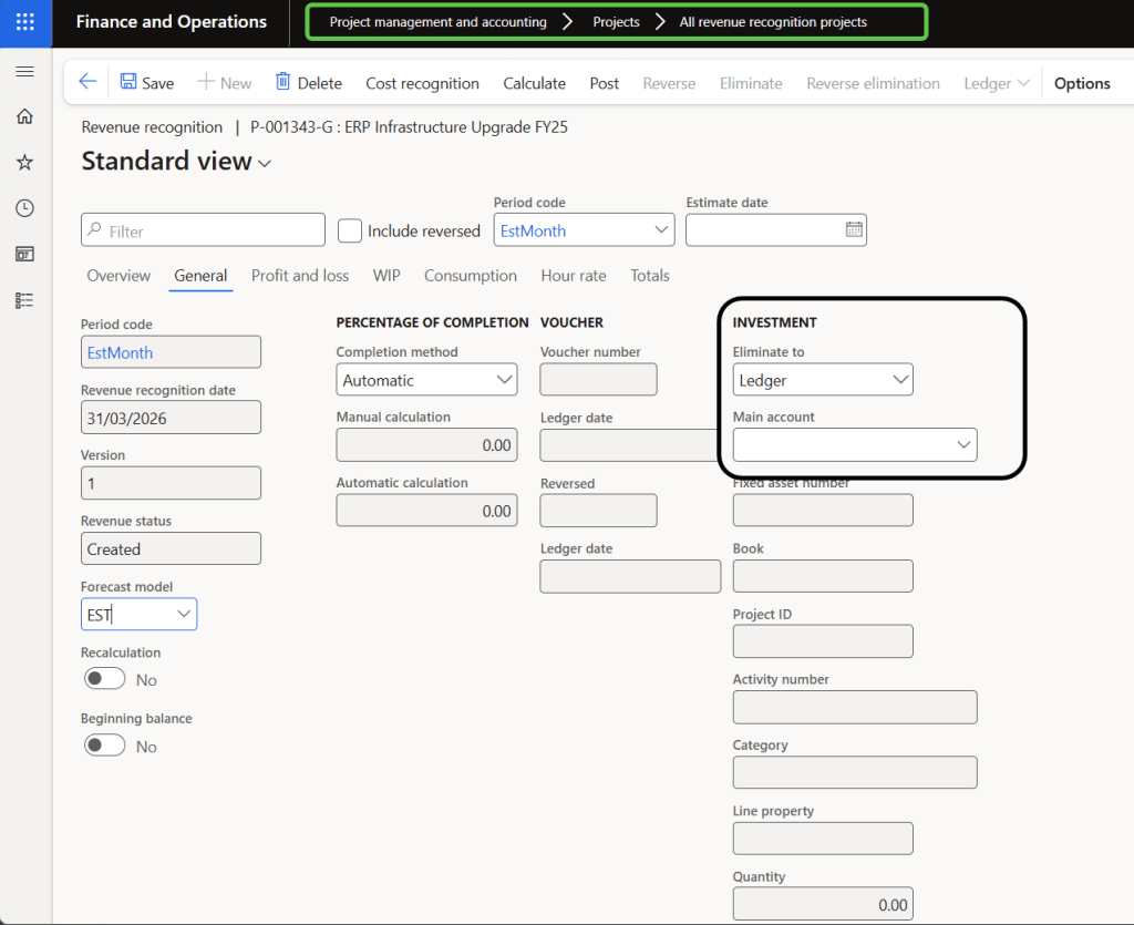 A revenue recognition project should have been automatically created with the same Project ID. Select it and confirm it is associated with your Investment project. This revenue recognition project is the mechanism through which WIP costs are later transferred to a ledger account or fixed asset during project completion.