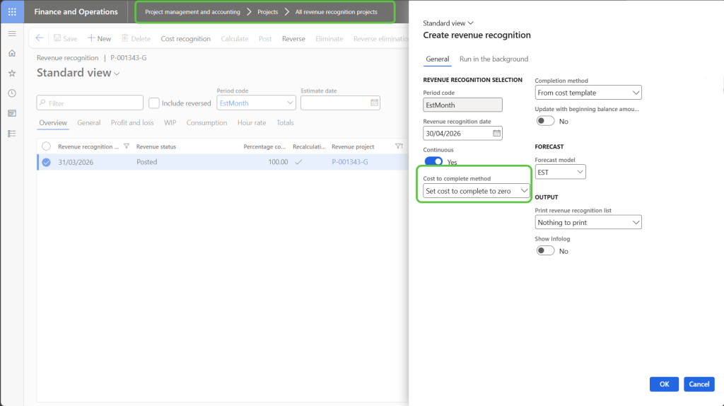 Click Revenue recognition and set Cost to complete method to “Set cost to complete to zero.”