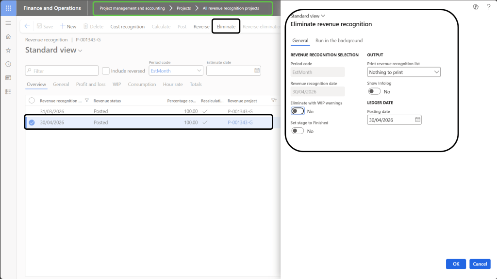 Click Eliminate. This transfers all accumulated WIP costs from the Balance Sheet (WIP accounts) to the Ledger account or Fixed asset you designated during the first revenue recognition run — completing the capitalisation cycle.