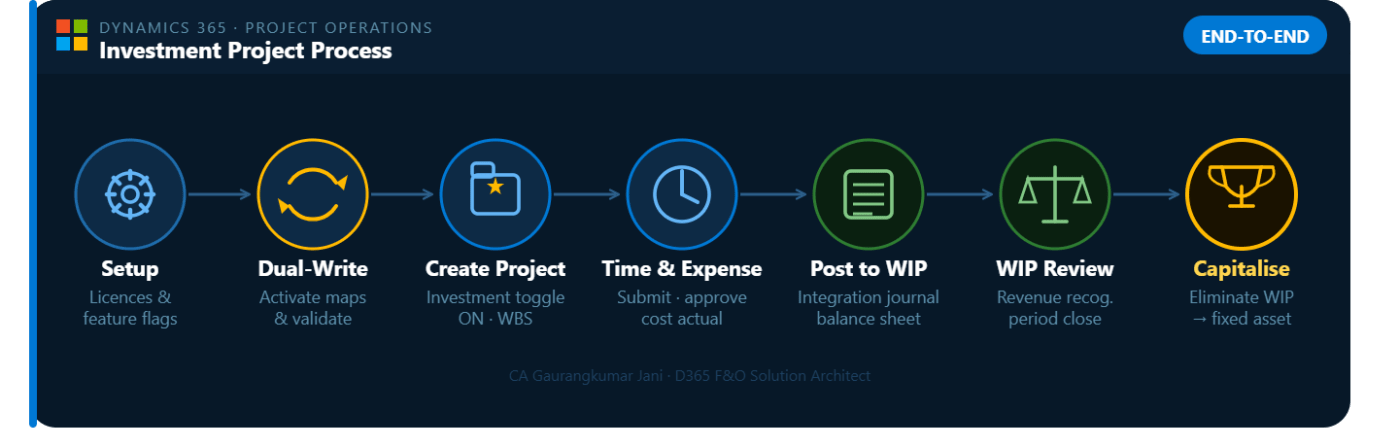 Managing an Investment Project end-to-end across Microsoft Dynamics 365 Project Operations and D365 Finance requires careful setup across two systems connected via dual-write. This guide is based on the latest Microsoft Learn documentation (last updated January 2026) and covers the complete lifecycle — from prerequisites and feature activation through to WIP capitalisation and financial review.