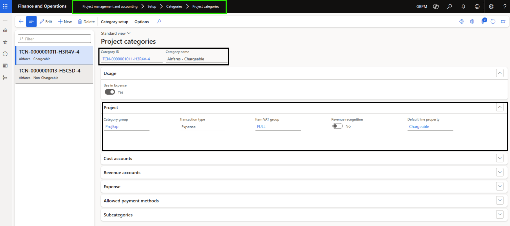 Confirm that the categories you defined in Project Operations are visible here after dual-write sync in shared categories. Once it’s available add relevant categories into Project Categories with proper category groups. Categories must align between both systems for the integration journal to post without errors.