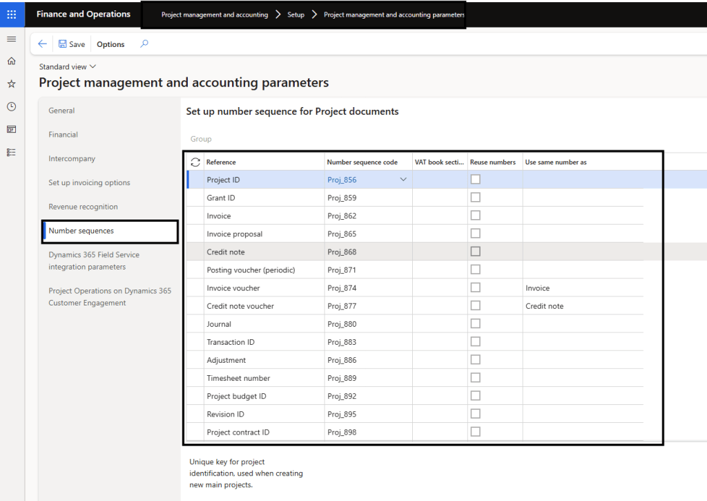 Navigate to: Project management and accounting → Setup → Project management and accounting parameters → Number sequences