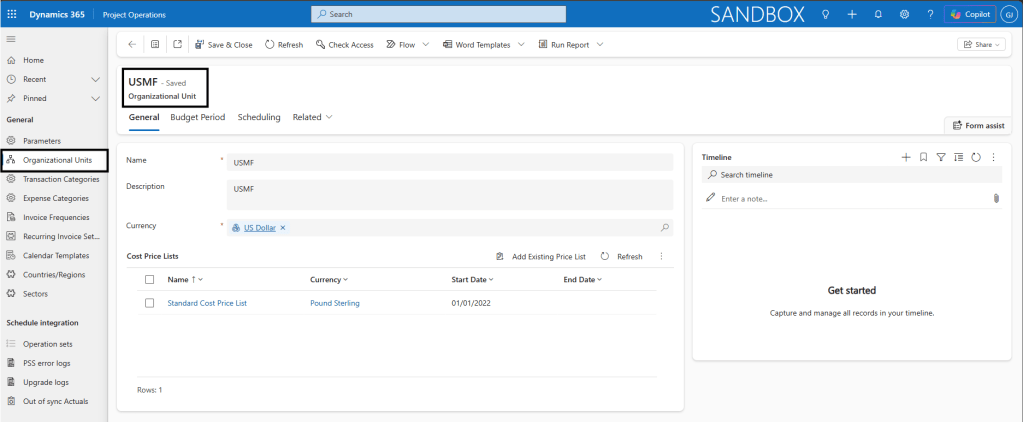 Create or verify the Organisational Unit that will own the investment project (e.g., Finance Division, Capital Projects Team). Each unit must have a cost currency and a cost price list assigned. The owning unit is the key reference that links a project to a legal entity in Finance via dual-write.